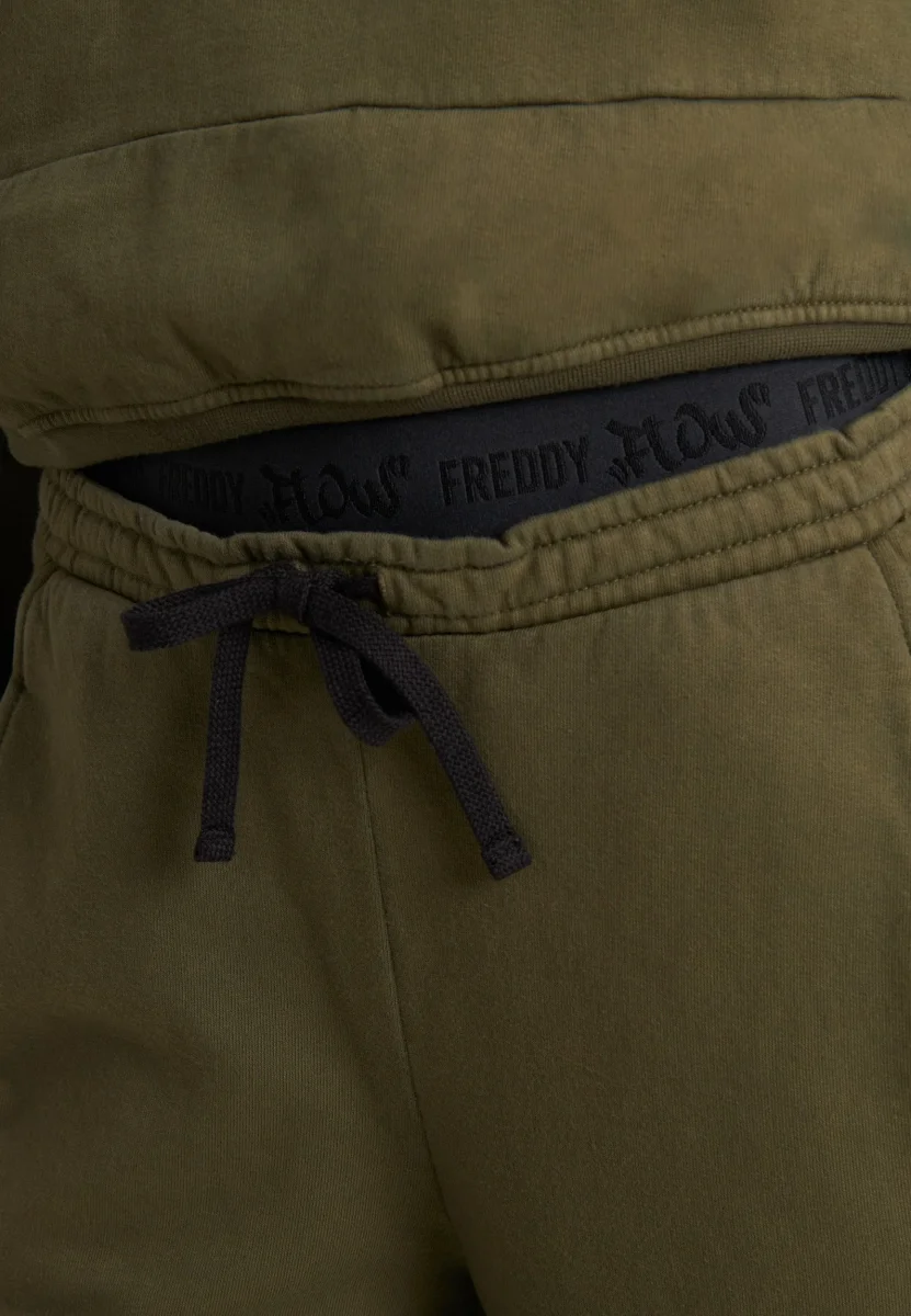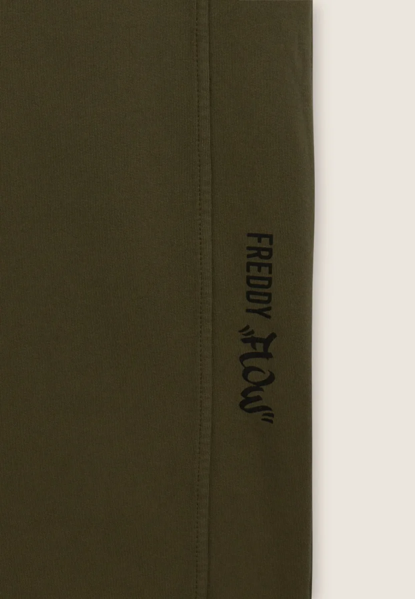 Wide leg and street details for these brushed fleece trousers. The “Flow” print with FREDDY logo on the side of the leg gives an artistic and original touch, while the logoed jacquard elastic waistband and drawstring ensure a comfortable fit. Intense colours and softness are guaranteed by the enzyme treatment: the must-have for a comfortable and trendy look.