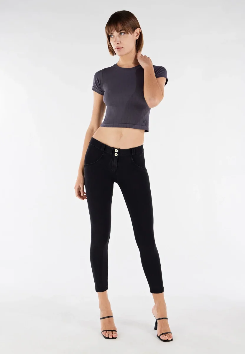 WR.UP® Pants i Svart kombinerar ikonisk Freddy-stil med exceptionell komfort. De kombinerar en modern 7/8-längd som subtilt framhäver dina anklar. Därtill kommer en bekväm medelhög midja för vardagskomfort. Looken avrundas med en slank skinny-passform som smiter åt runt dina kurvor. Tillverkade erbjuder den klassiska denimlooken med komforten hos ett mjukt, flexibelt tyg. Som en del av WR.UP®-kollektionen har de patenterad teknologi designad för att naturligt framhäva och forma din silhuett. Italiensk design som utstrålar självförtroende och stil.